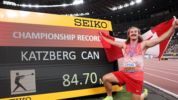 Ethan Katzberg of Nanaimo, B.C. successfully defended his hammer throw world championship gold medal, with a throw of 84.70 metres in Tokyo, setting a championship and Canadian record in the process.